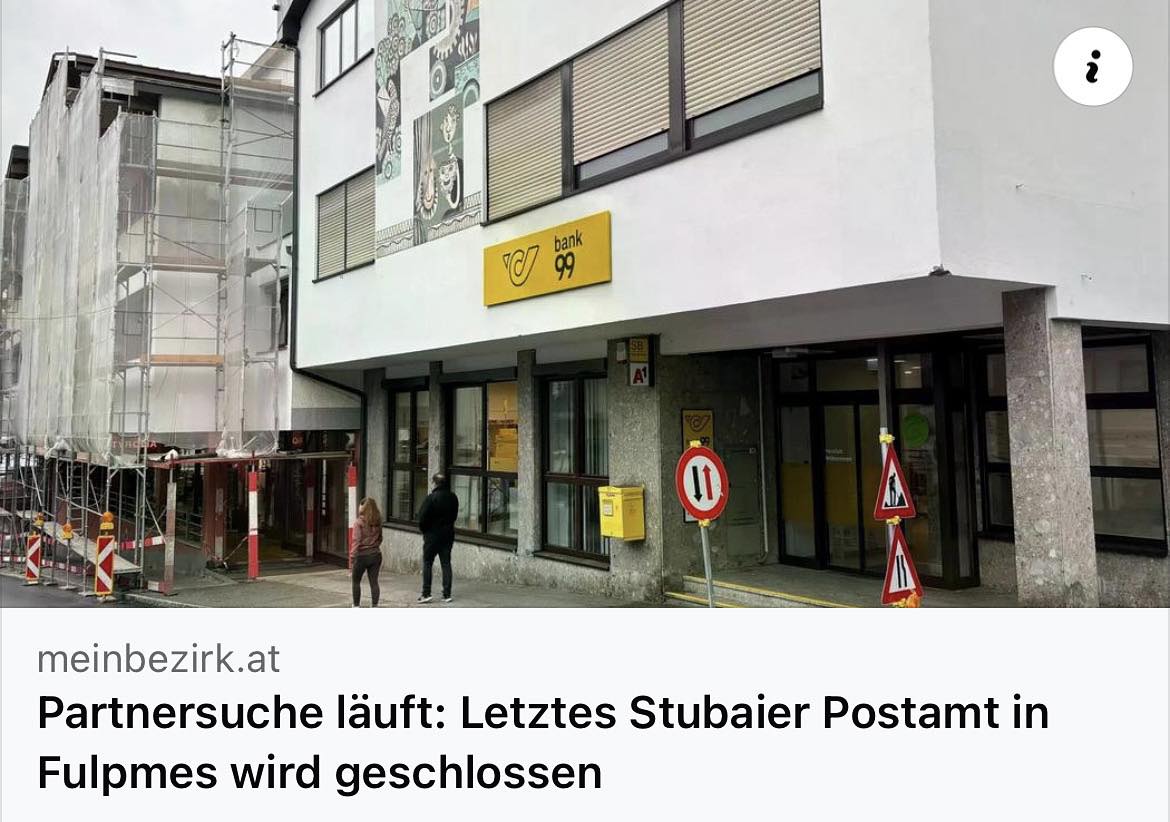 Von Paketen über Briefe: Die Poststelle in Fulpmes ist für viele Menschen im Tal ein wichtiger Anlaufpunkt für tägliche Erledigungen. Wir werden alles unternehmen, um unseren Standort hier in Fulpmes zu bewahren. Ein Postpartner im Tal ist dringend notwendig, damit diese [...]